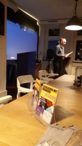 De sfeer in het zaaltje van Geniet aan de Amstel was, zoals altijd, intiem en open. Er waren drie voorzichtige nieuwelingen die de stap naar voordragen en public waagden. Zij vertrokken opgelucht en enthousiast. ‘Ik wist niet zeker of ik het zou durven, maar het voelde zo vertrouwd dat ik het toch gedaan heb. Wat leuk als je merkt dat je iets losmaakt bij mensen’, aldus een van de nieuwelingen.