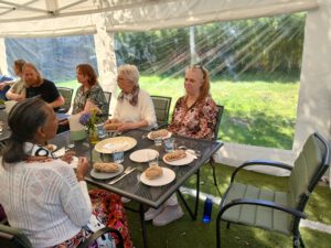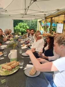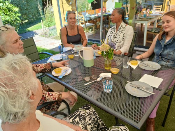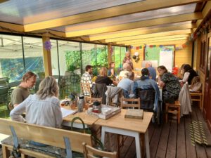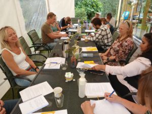 Na de voortreffelijke lunch in de tuin was er ruim aandacht voor het schrijven van een synopsis, zeg maar een soort uittreksel van je verhaal waarmee je een uitgever in slechts enkele alinea’s probeert te interesseren om jouw boek uit te geven. De interesse voor dit aspect van het schrijfproces was erg groot, want velen hebben al materiaal klaar liggen, maar hoe benader je een uitgever? Door de Flines heeft vele jaren bij uitgeverijen gewerkt en legde haarfijn uit waar de triggers zitten en waar de valkuilen. Mogelijk krijgen we in 2026 een tsunami van lokale schrijvers. Houd de aankondigingen het BSPU in de media en op de site www.bspu.nl in de gaten!